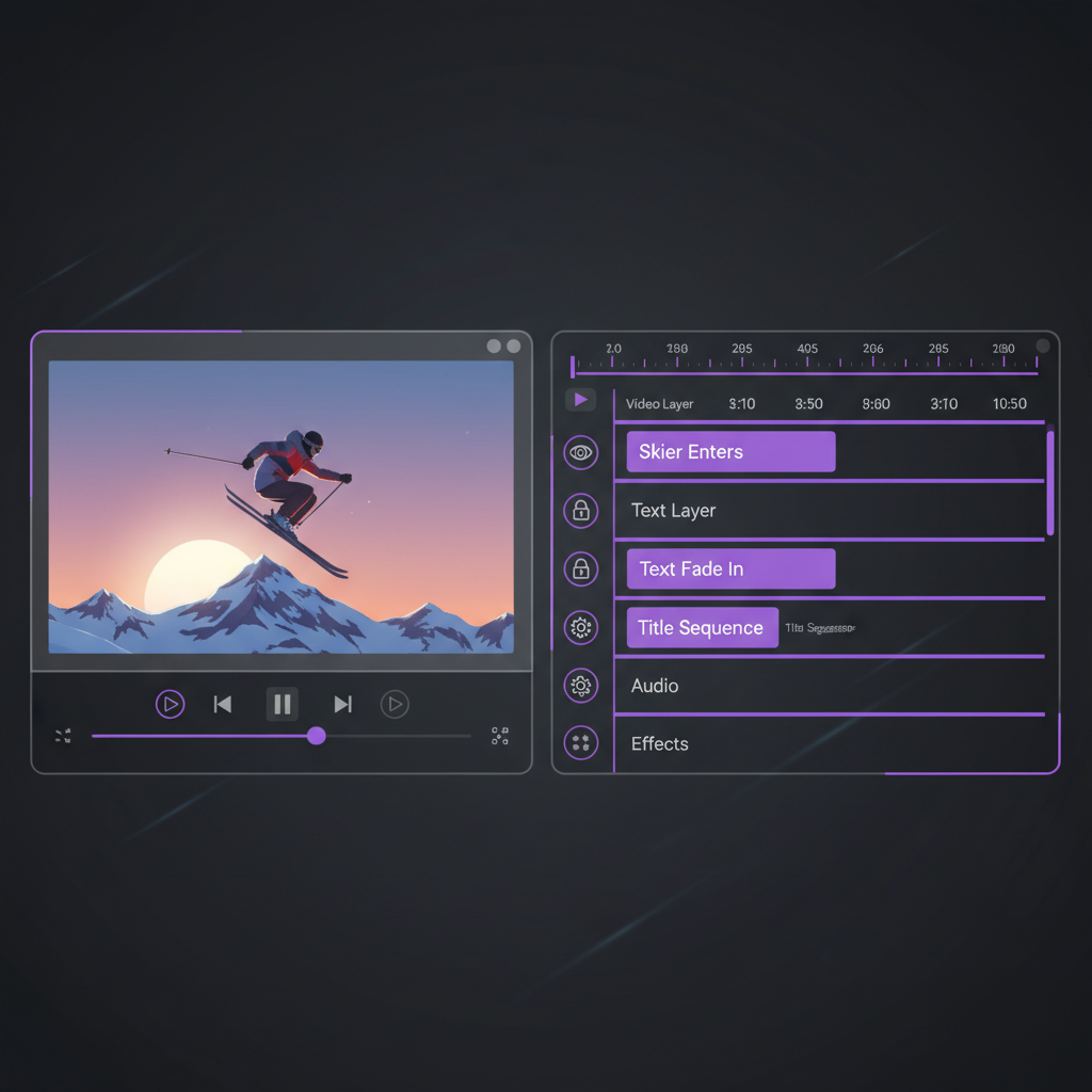 - A Narrative Timeline: It breaks down the animation into semantic blocks, like "skier enters" and "text appears," which users can drag to re-sequence or re-time.