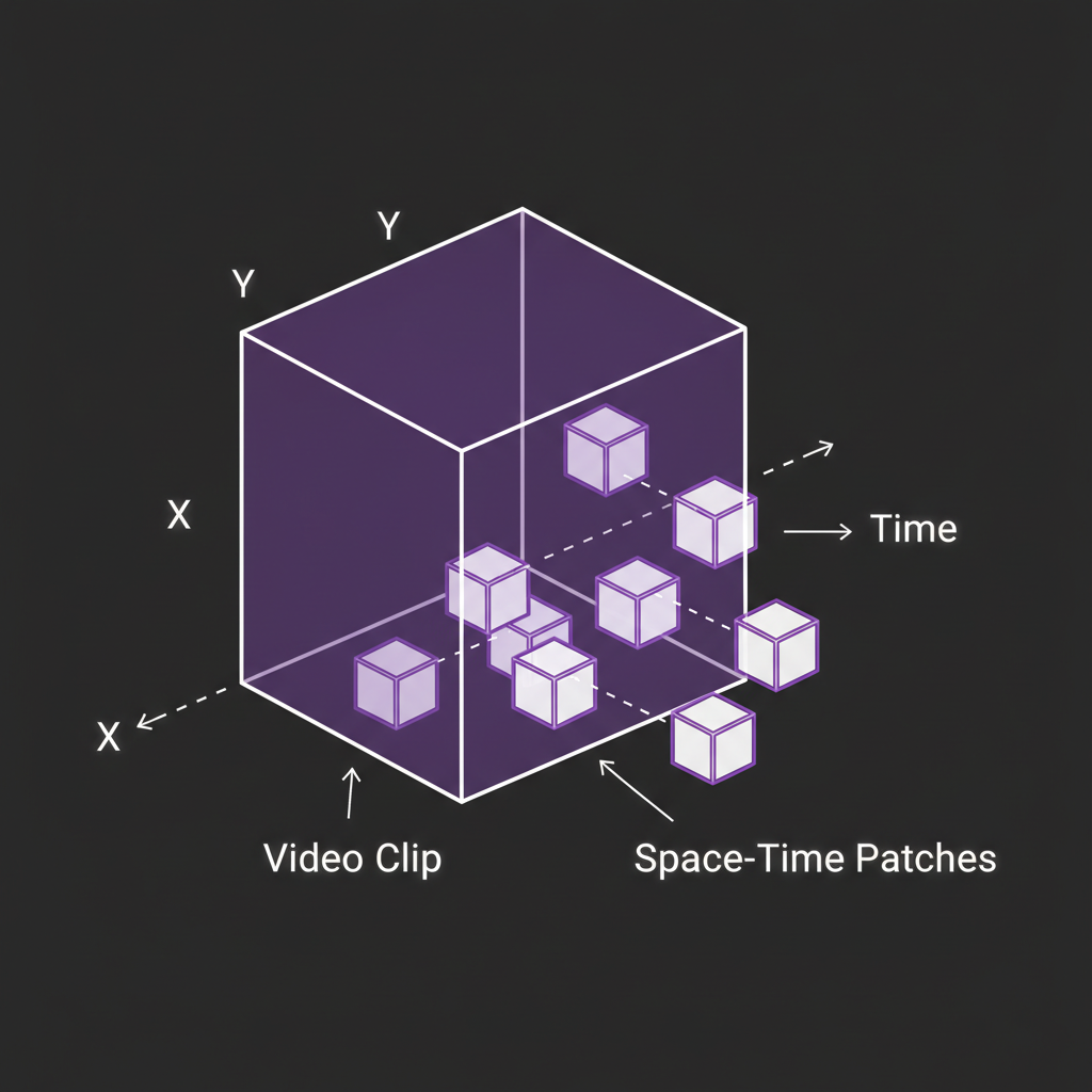 - Space-Time Patch: A small, cuboid-like chunk of a video that contains information across both spatial dimensions (height and width) and the temporal dimension (time). Sora processes video as a collection of these patches.