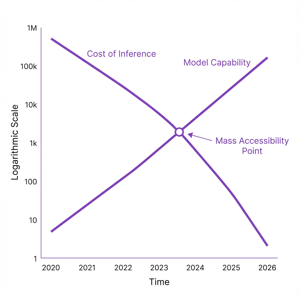 - Intelligence is commoditizing: Inference costs are dropping ~10x annually for constant performance.