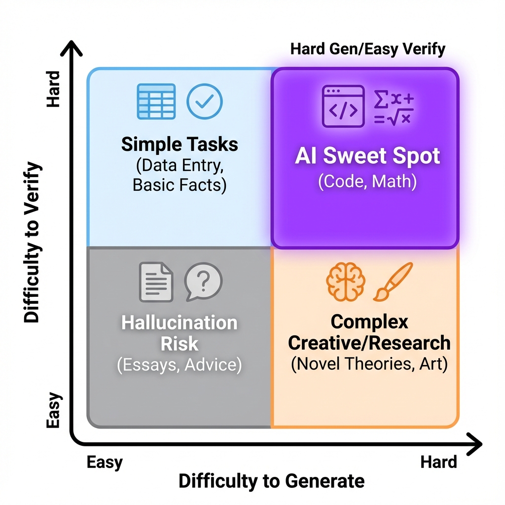 For individuals and organizations, the strategy is clear: identify where your work sits on the verification matrix. If you are in a "Hard to Generate, Easy to Verify" field, prepare for rapid AI integration. If you are in a "Hard to Verify" field, your human judgment remains your moat—at least for now.