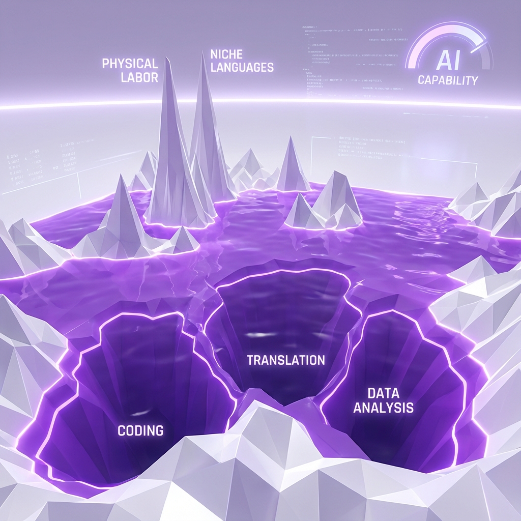 The Jagged Frontier: Progress does not happen all at once. Digital, verifiable valleys are flooded with automation while physical peaks remain dry.